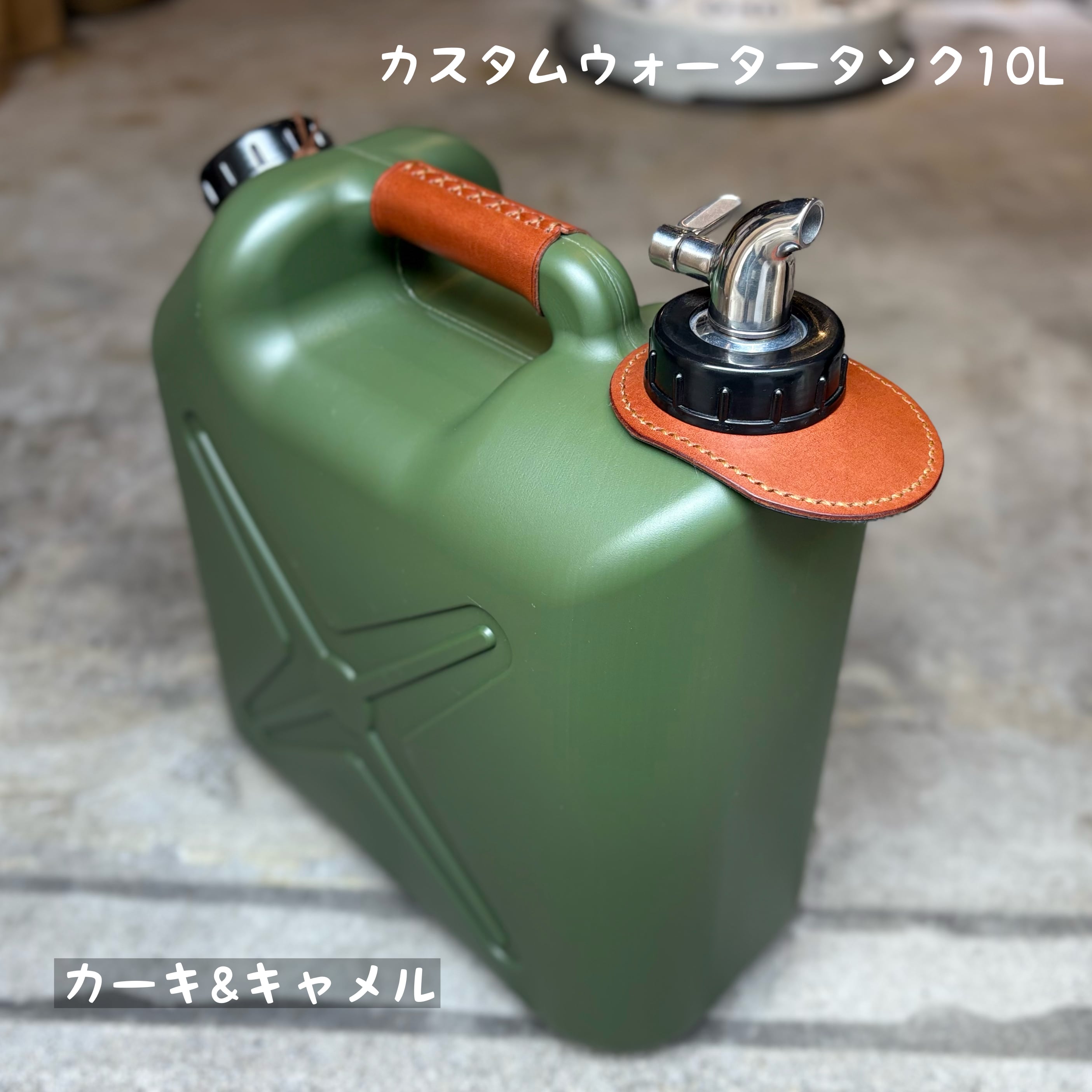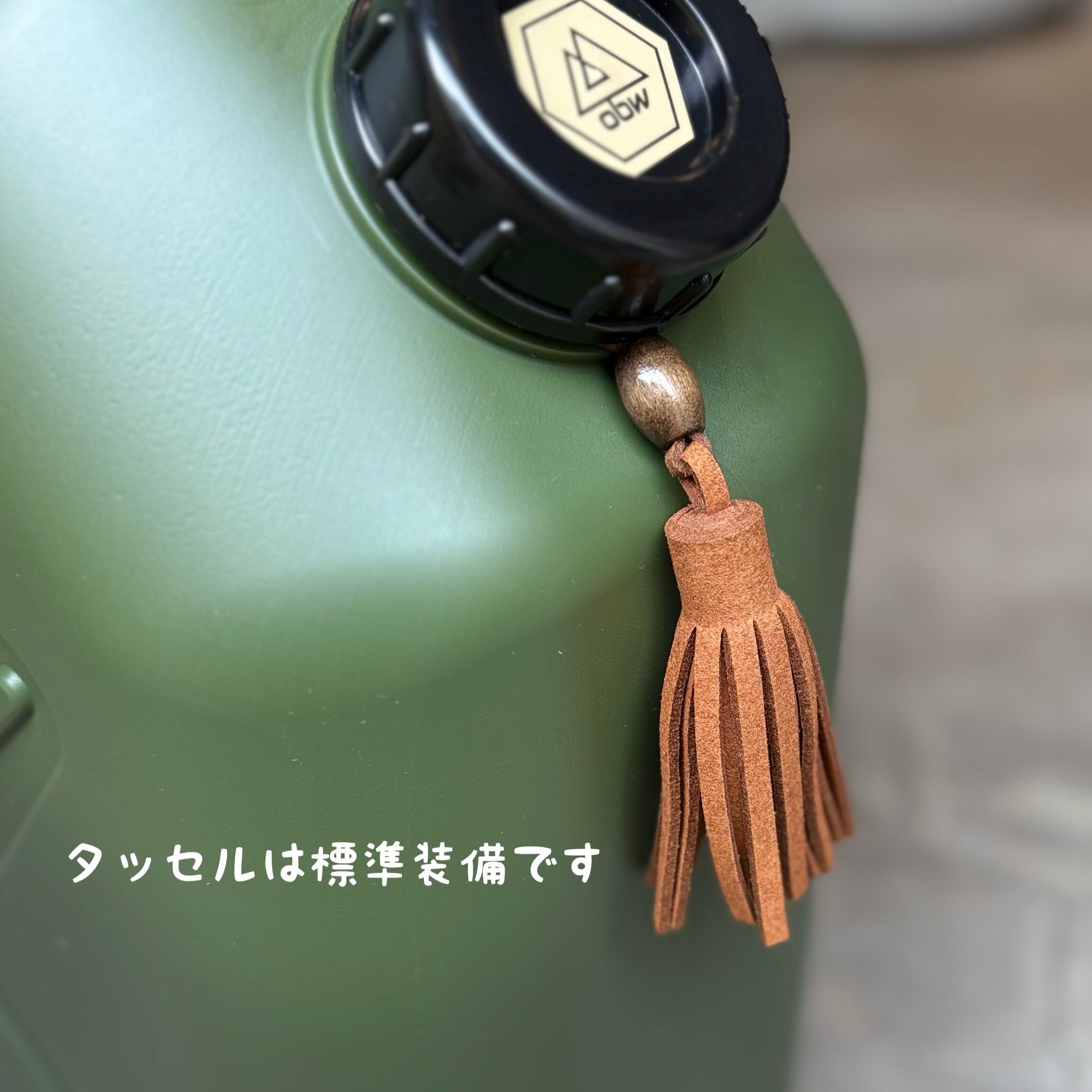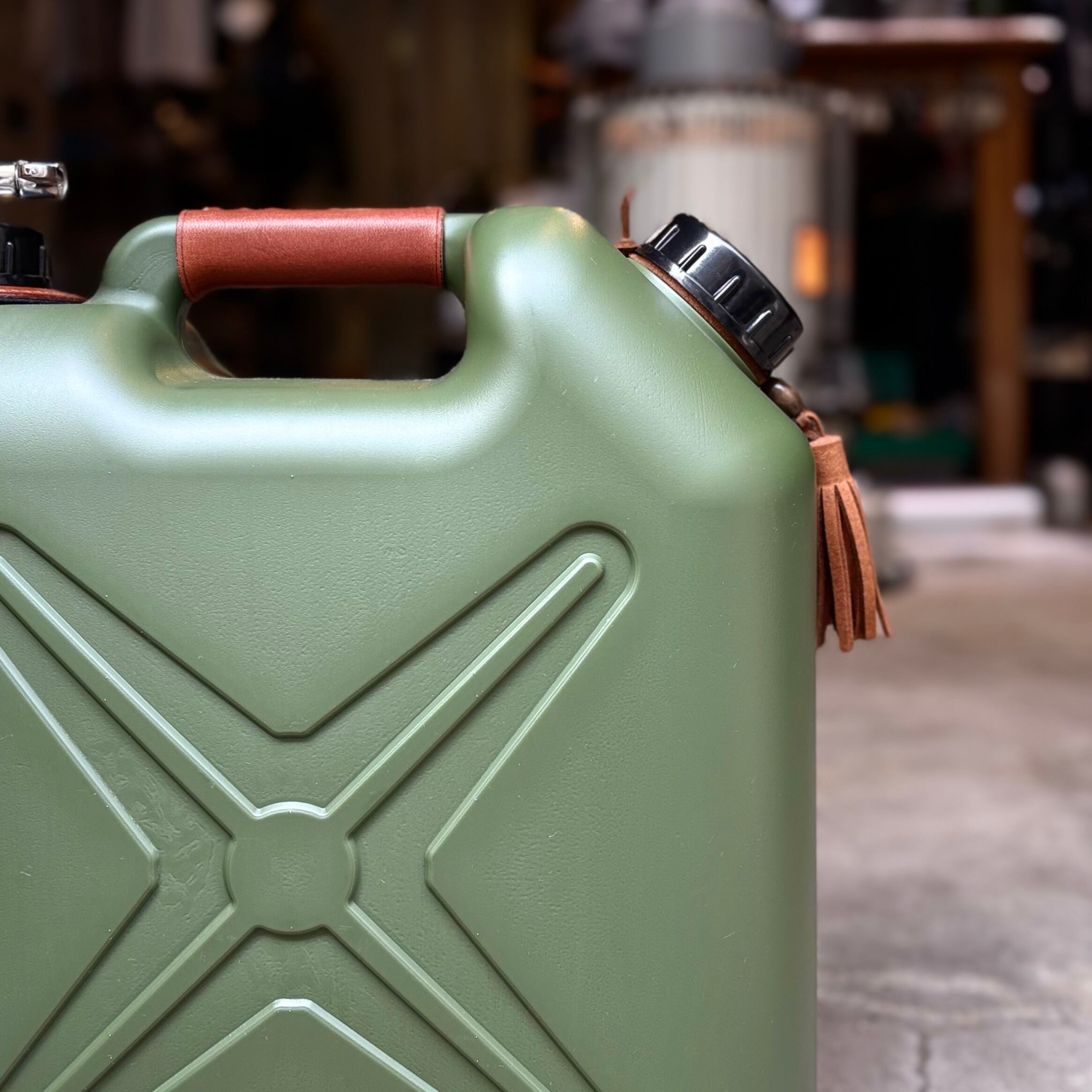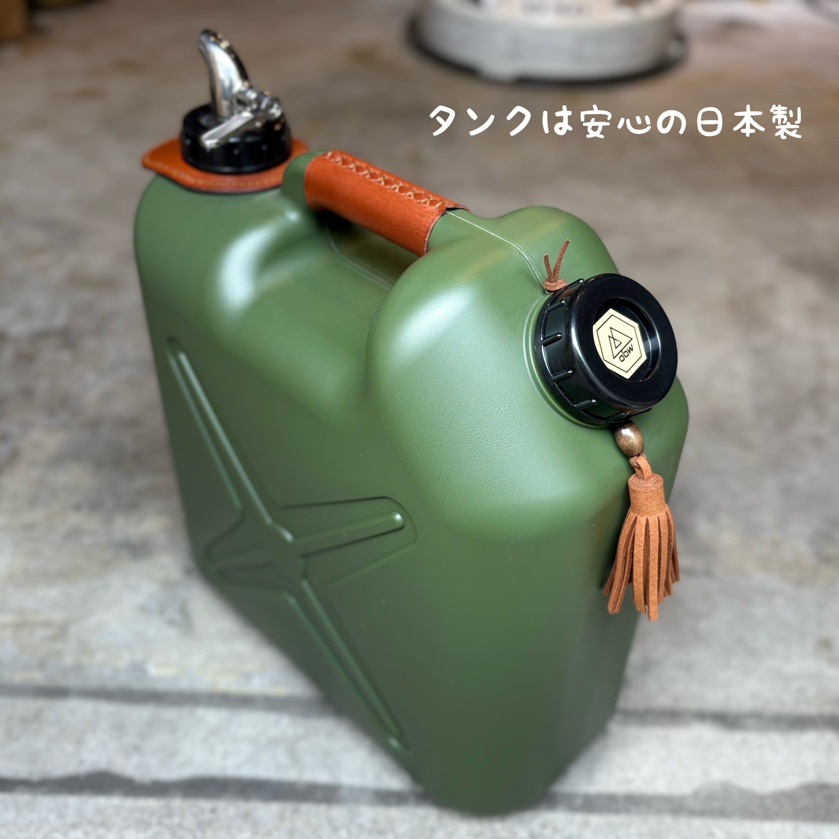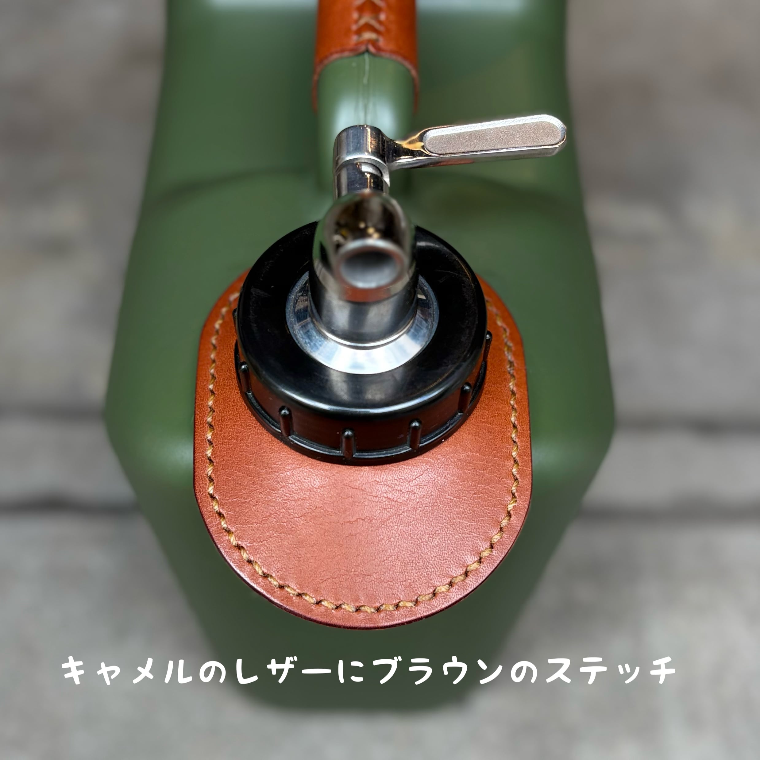 両手が使えるようサーバーコックを取り付け、アクセントにレザーやタッセルで飾り付けしてあり、他とは一味違ったギアとしてキャンプサイトの雰囲気もグッと良くなります。