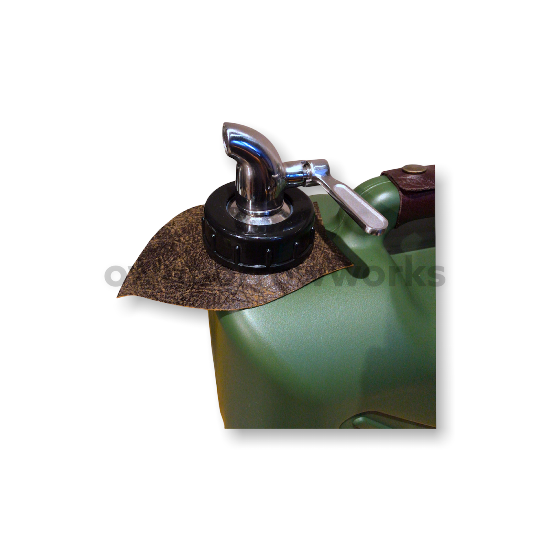 両手が使えるようサーバーコックを取り付け、アクセントとしてレザーやタッセルで飾り付けしてあるので、他とは一味違ったギアとしてキャンプサイトで映えると思います。