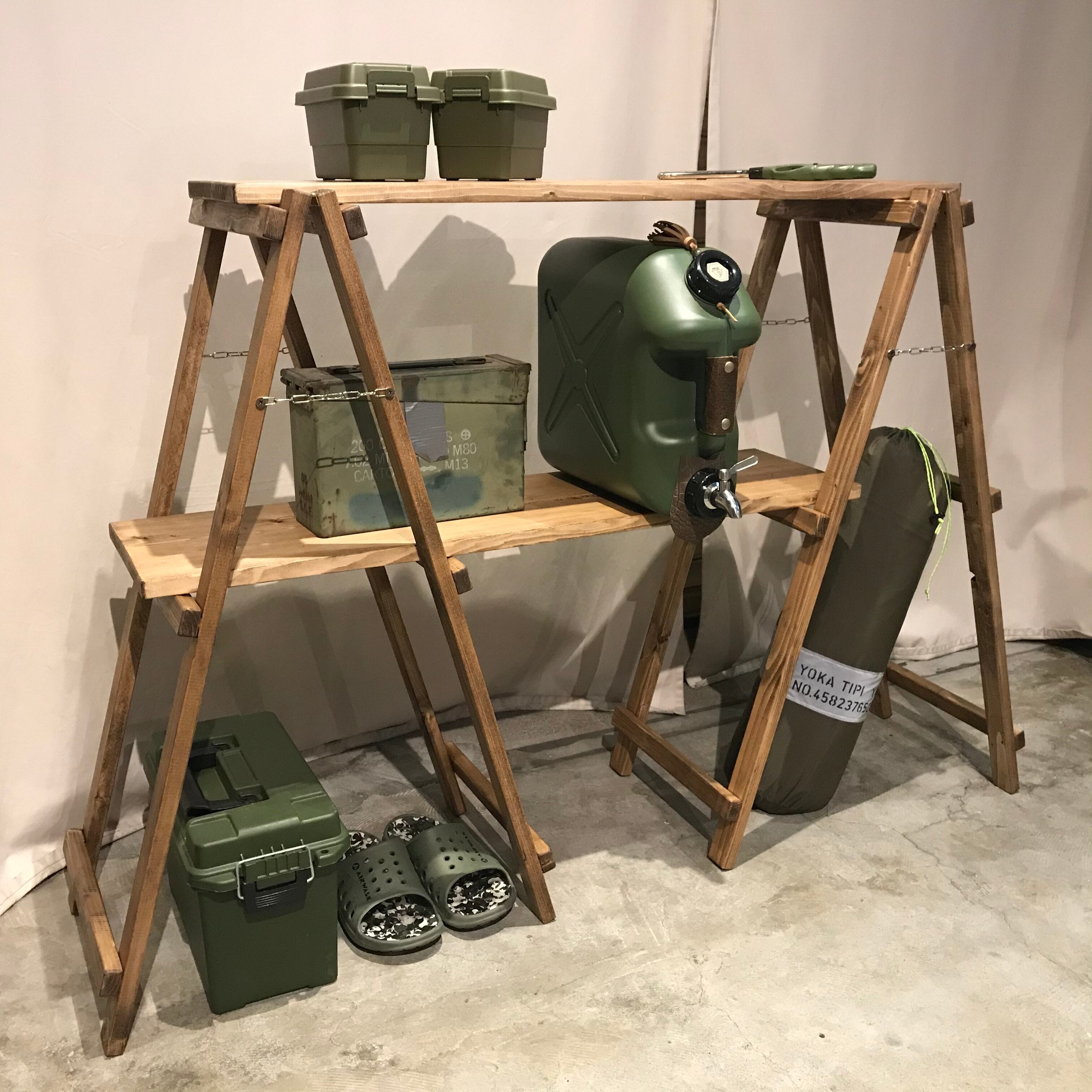 収納サイズは、畳んだAスタンドに棚板を挟み横長に置いた状態で