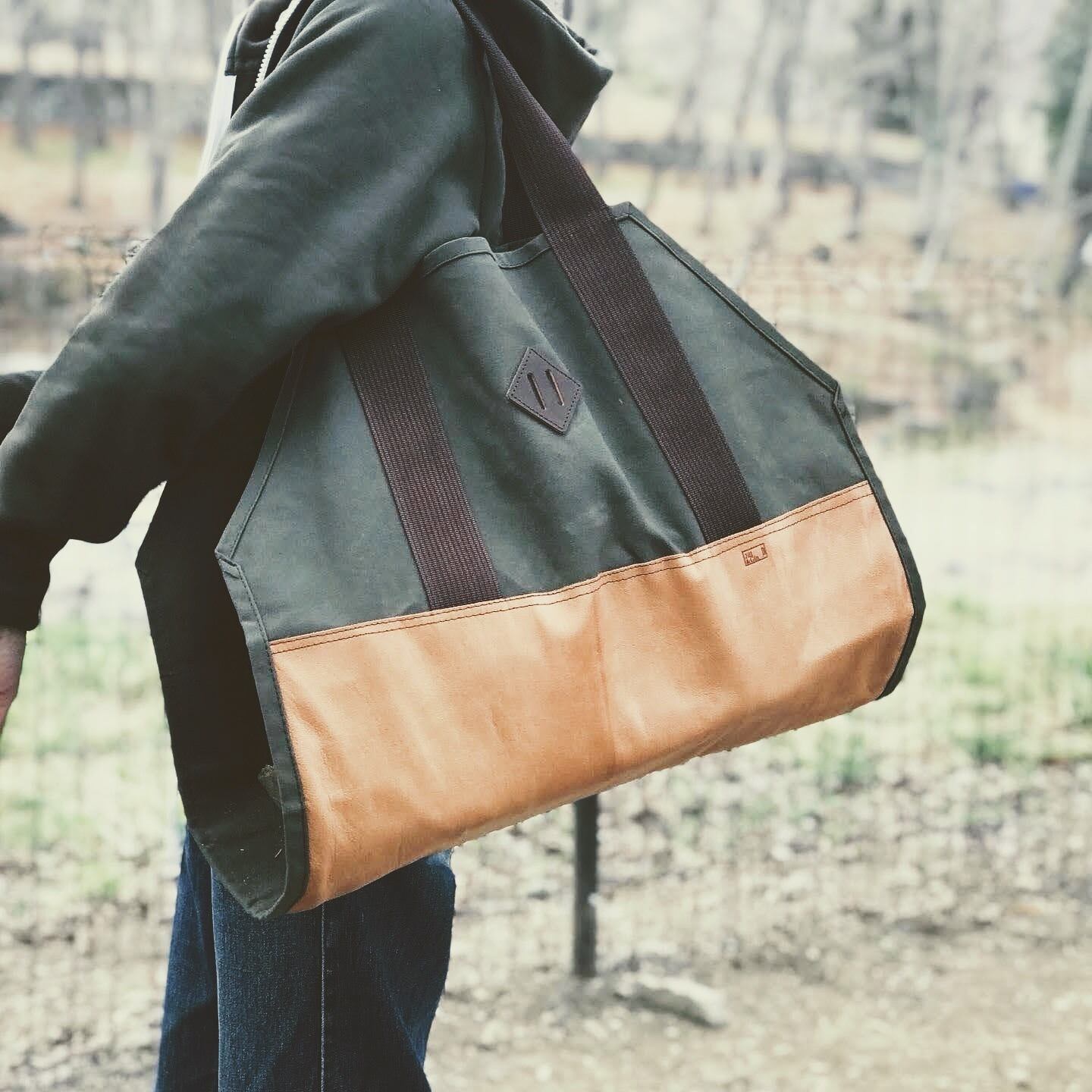 アンティークな雰囲気もあじわえるワイルドなゴートレザーと、パラフィン加工が施されたカーキのコットン帆布を使った薪用バッグ。