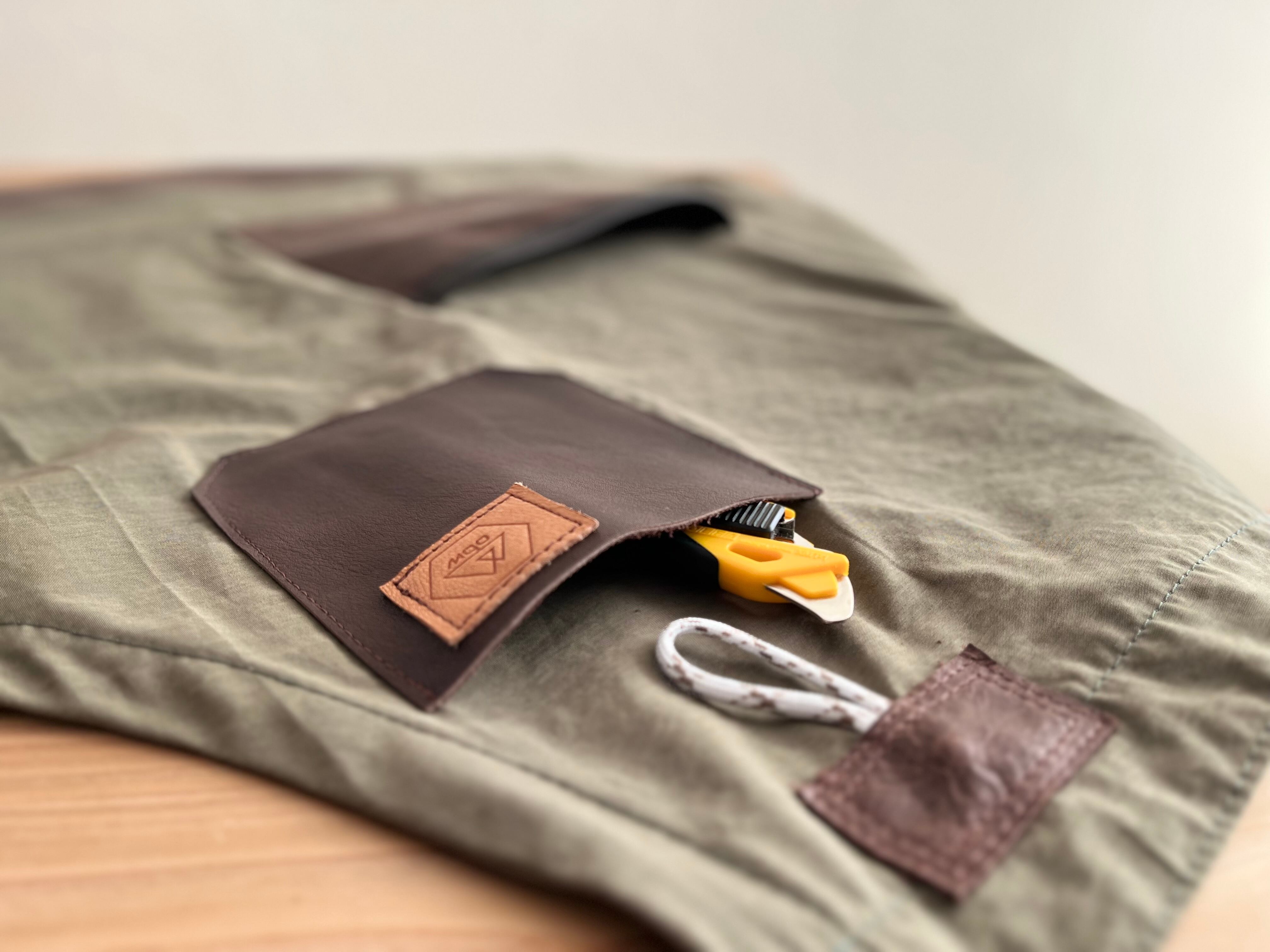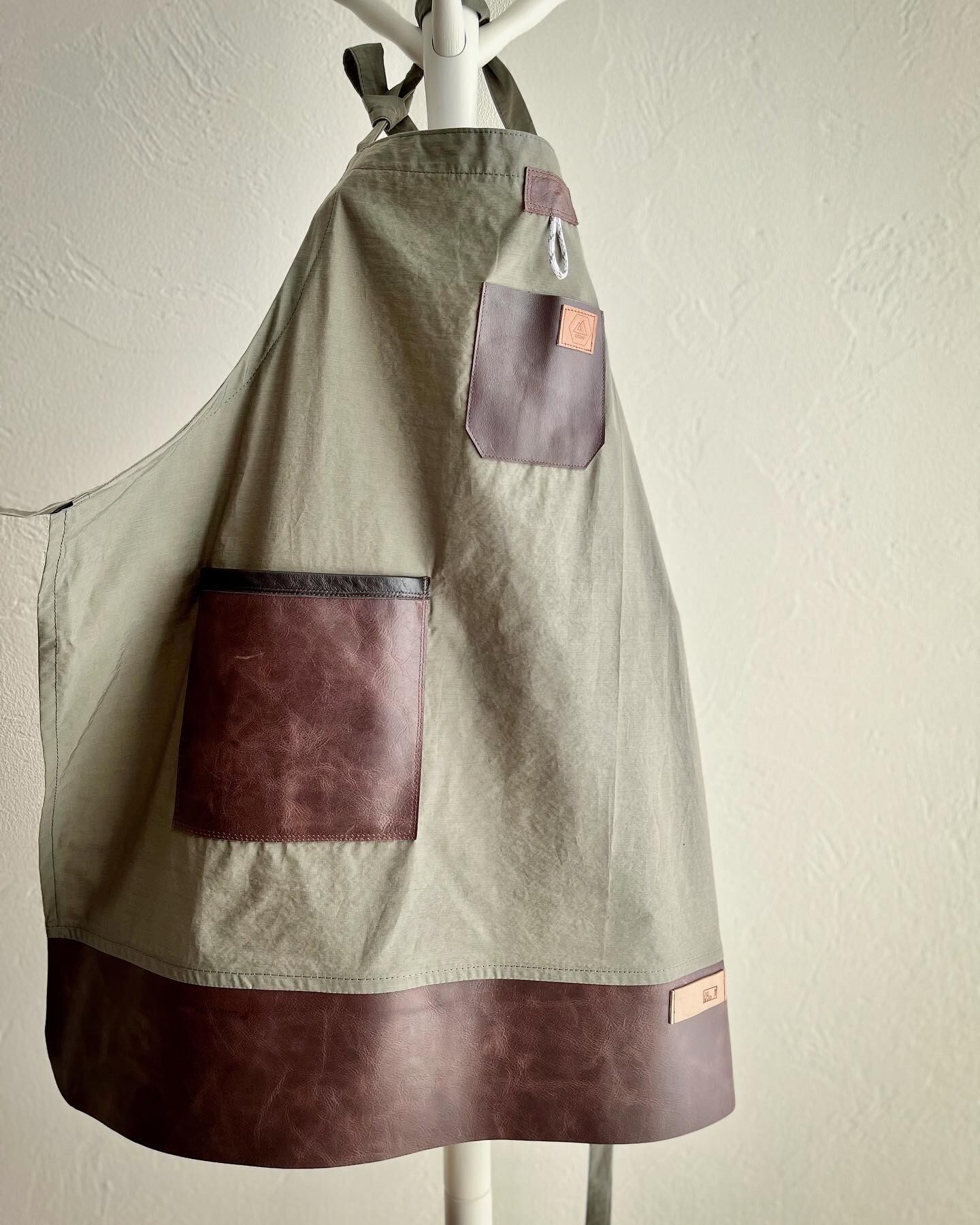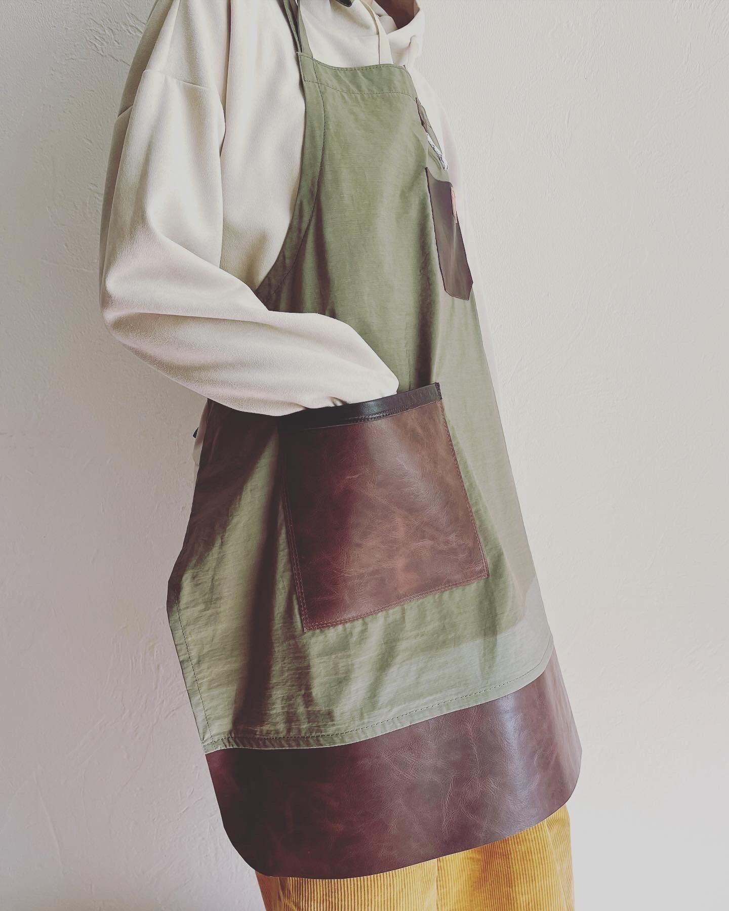 ポケットや裾部分にアンティーク調レザーを使ったアウトドア向けエプロン