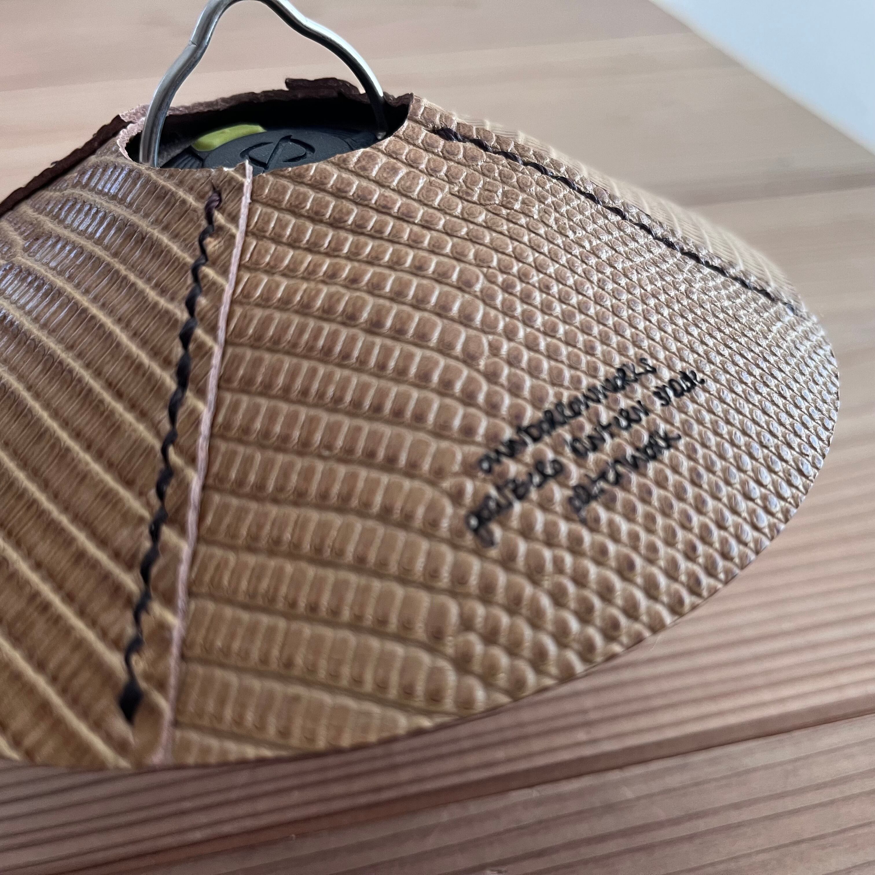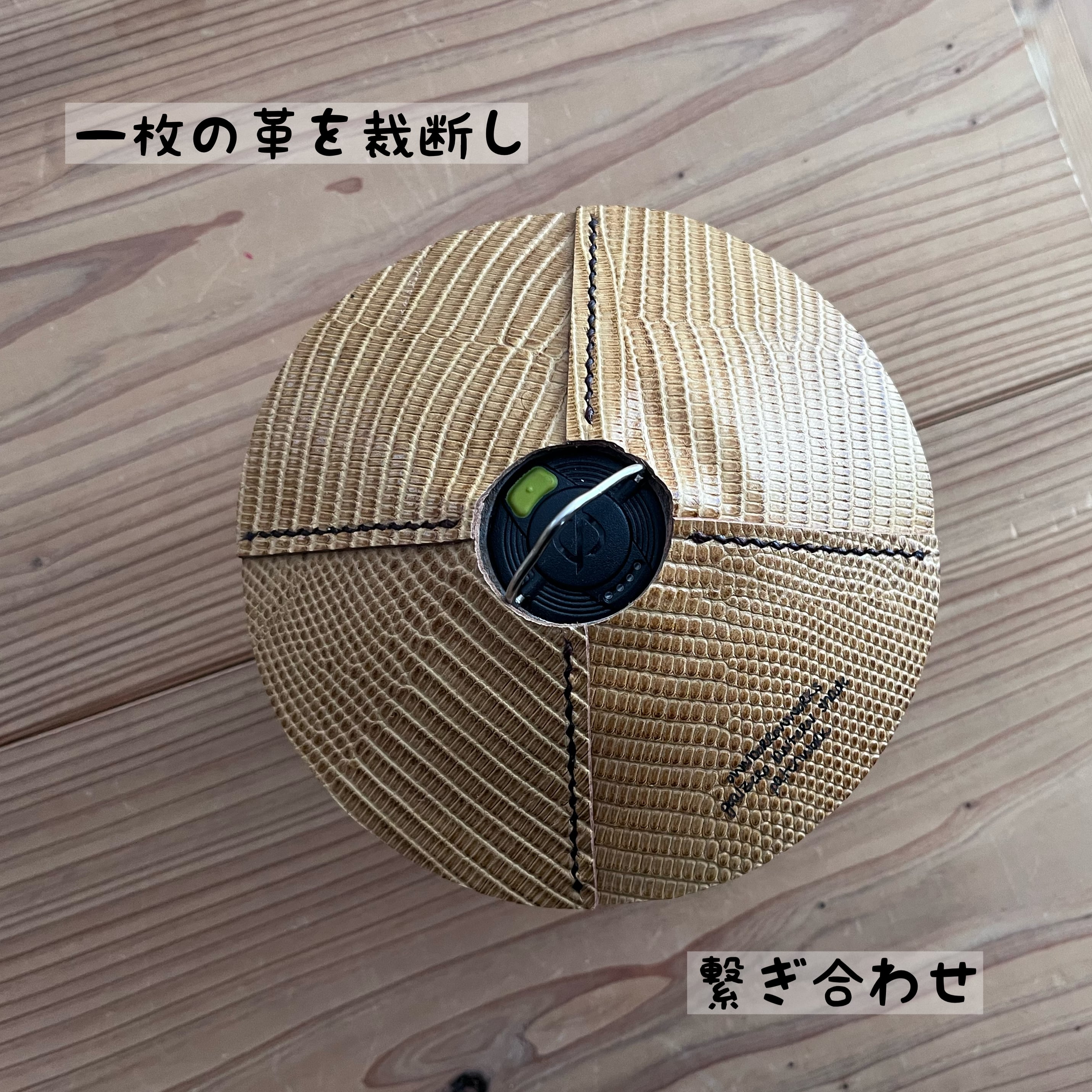 マスタード色のクロコダイルの型押し革を裁断し手縫いで繋ぎ合わせた、他にはない独特な雰囲気を楽しめる商品となっています